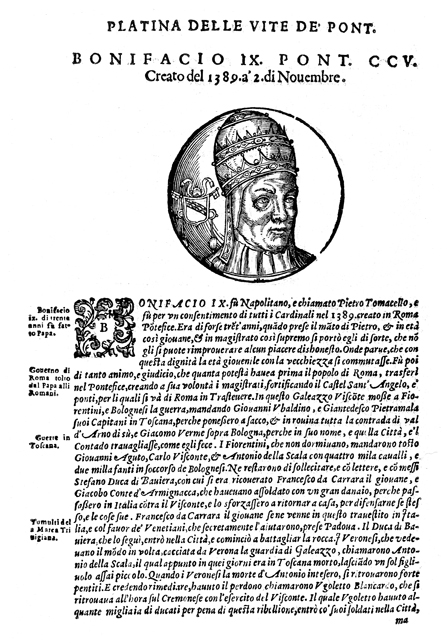 Description: An image of Boniface IX, Pope of the Roman Catholic Church (r. 1389-1404 CE). He wears a pallium while to the left is Boniface’s coat of arms with the papal triple tiara above.