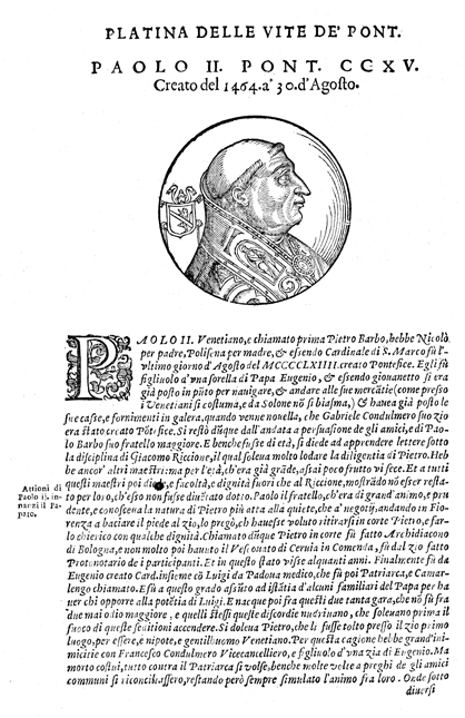 [Historia delle vite de sommi pontefici : dal Salvator Nostro sino a Gregorio XV / Scitta già da Battista Platina Cremonese ; dal P.F. Onofrio Panvinio da Verona, da Antonio Cicarelli da Foligno e da D. Giovanni Stringa Venetiano. Et hora ampliata dal M.R.P.F. Abramo Bzovio, Maestro di Theologia dell'ordine de Predicatori delle vite di Paolo V & di Greg. XV. Illustrata con le Annotationi del Panvinio, nelle vie descritte dal Platina, e con la Cronologia Ecclesiastica dell'istesso, tradotta in lingua Italiana & ampliata dal R.M. Bartolomeo Dionigi da Fano, da D. Lauro Testa, e dal detto P.F. Abramo Bzovio. Ornata nuovamente di bellissimi ritratti di tutti i Pontefici al naturale. Arrichita con'nomi, cognomi, patrie et titoli di tutti quei Cardinali de quali s'è potuto haver cognitione, raccolti per il sudetto Dionigi dall'opere del Panvinio e da gli arti della Cancellaria Apostolica.]
