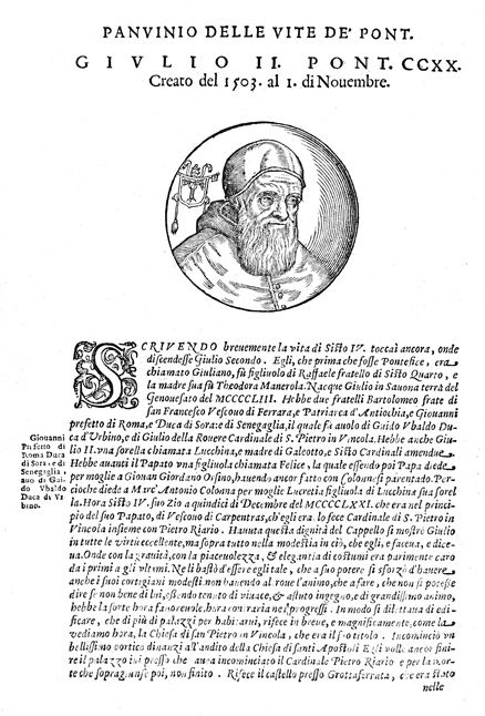 Description: An image of Julius II, the Bishop of Lausanne (r. 1472-1473 CE), the Bishop of Catania (r. 1473-1474 CE), the Archbishop of Avignon (r. 1474-1503 CE), the Bishop of Carpentras (r. 1475-1476 CE), the Bishop of Coutances (r. 1476-1477 CE), the Bishop of Viviers (r. 1477-1479 CE), the Bishop of Mende (r. 1478-1483 CE), the Cardinal-Bishop of Sabina (r. 1479-1483 CE), the Bishop of Coutances (r. 1476-1478 CE), the Bishop of Bologna (r. 1483-1502 CE), the Cardinal-Bishop of Ostia (r. 1483-1503 CE), the Bishop of Lodeve (r. 1488-1489 CE), the Bishop of Savona (r. 1499-1502 CE), the Bishop of Vercelli (r. 1502-1503 CE), and Pope of the Roman Catholic Church (r. 1503 CE). He wears a pallium while to the left is Julius’ coat of arms with the papal triple tiara above.