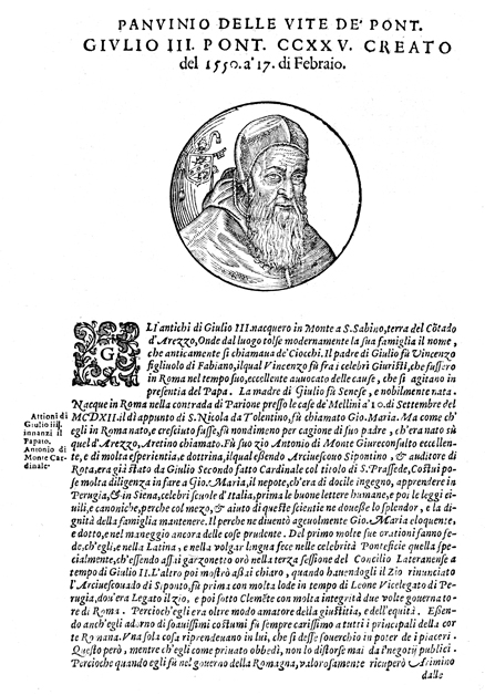 Description: An image of Julius III, Pope of the Roman Catholic Church (r. 1550-1555 CE). He wears a pallium while to the left is Julius’ coat of arms with the papal triple tiara above.