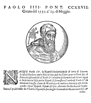 Description: An image of Paul IV, the Cardinal-Bishop of Albano (r. 1544-1546 CE), the Cardinal-Bishop of Sabina (r. 1546-1550 CE), the Cardinal-Bishop of Frascati (r. 1550-1553 CE), the Cardinal-Bishop of Porto (r. 1553 CE), the Cardinal-Bishop of Ostia (r. 1553-1555 CE), and the Pope of the Roman Catholic Church (r. 1555-1559 CE). He wears a pallium while to the left is Paul’s coat of arms with the papal triple tiara above.