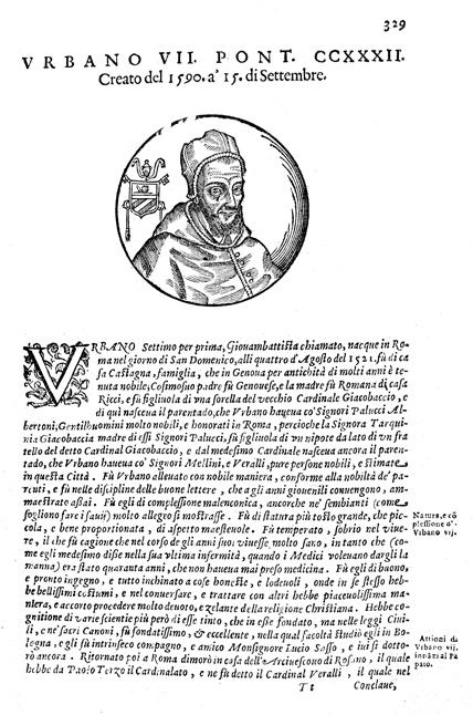 Description: An image of Urban VII, Pope of the Roman Catholic Church (r. 1590 CE). He wears a pallium while to the left is Urban’s coat of arms with the papal triple tiara above.
