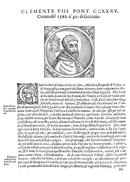 Description: An image of Clement VIII, the Pope of the Roman Catholic Church (r. 1592-1605 CE). He wears a pallium while to the left is Clement’s coat of arms with the papal triple tiara above.