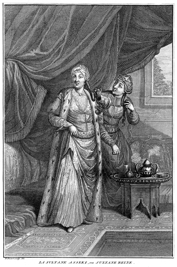 Description: The Sultana Asseki was chosen to be part of the harem and given the title of “Queen”. Engraved by Bernard Picart (1673–1733).