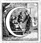 Description: An initial letter C depicting a woman holding a child as two men approach.