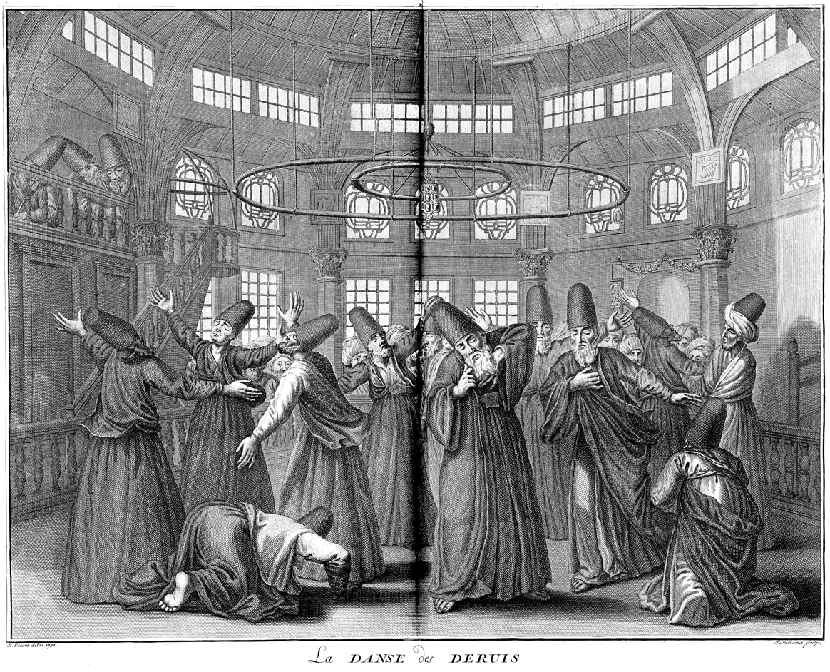 Description: Dervishes of the Mevlevi Order of Turkey perform the Sema, a worship ceremony that includes dancing. Drawn by Bernard Picart (1673–1733).