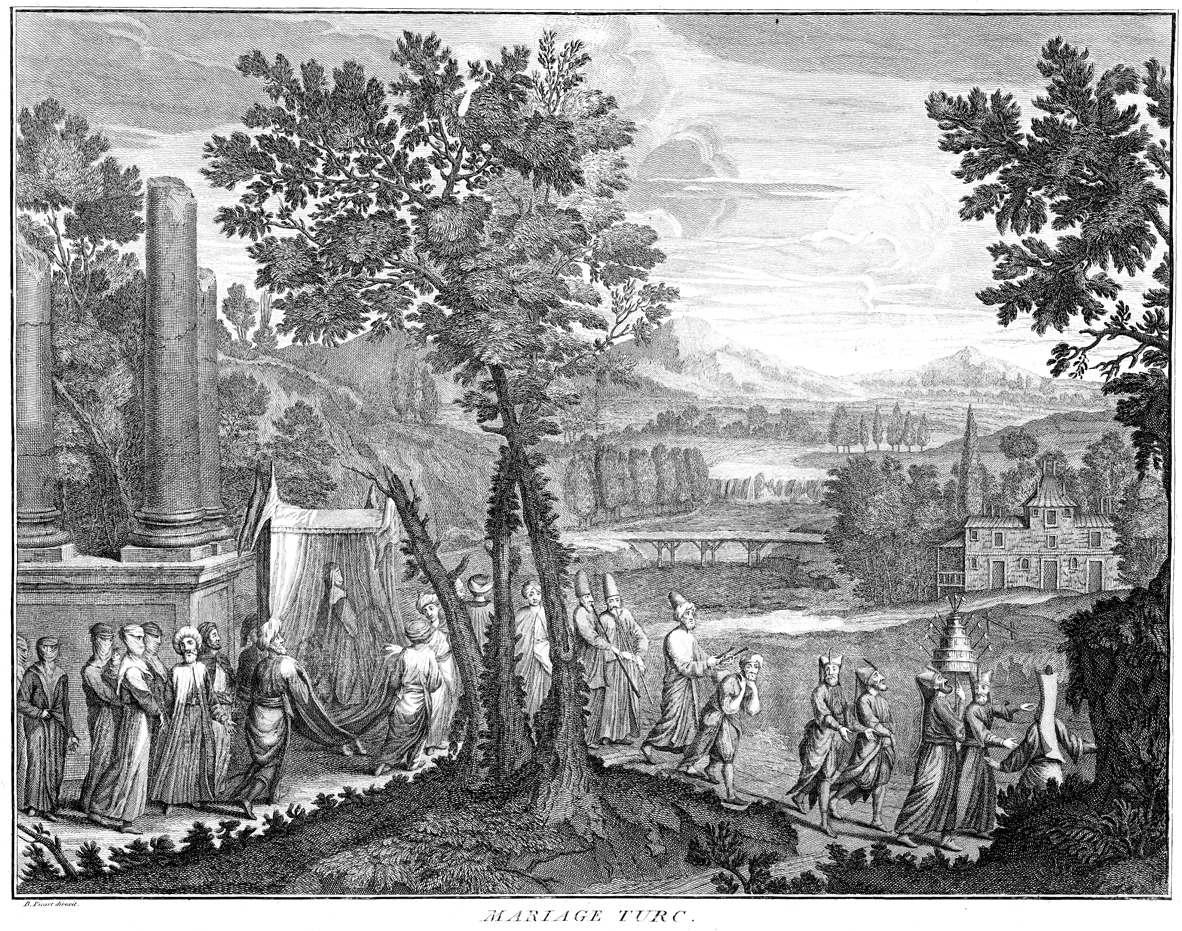 Description: A Turkish wedding procession. Drawn by Bernard Picart (1673–1733).