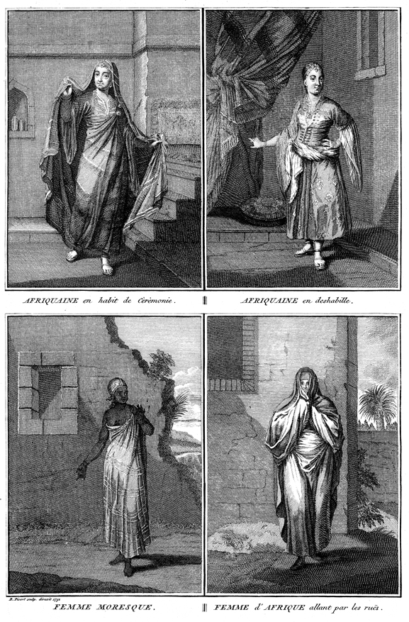 Description: Clockwise from top left: an African Muslim woman wears ceremonial attire, an African Muslim woman in more casual clothing; an African woman is covered up to go out in public and the final image is a Moorish woman. Engraved by Bernard Picart (1673–1733).