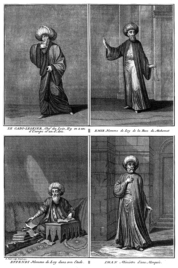 Description: Various Muslim leaders. Clockwise from top left: a kazasker (chief judge); an emir (scholar of Islamic law); an imam (a leader of a mosque) and an effendi (scholar of the law) studies. Engraved by Bernard Picart (1673–1733).