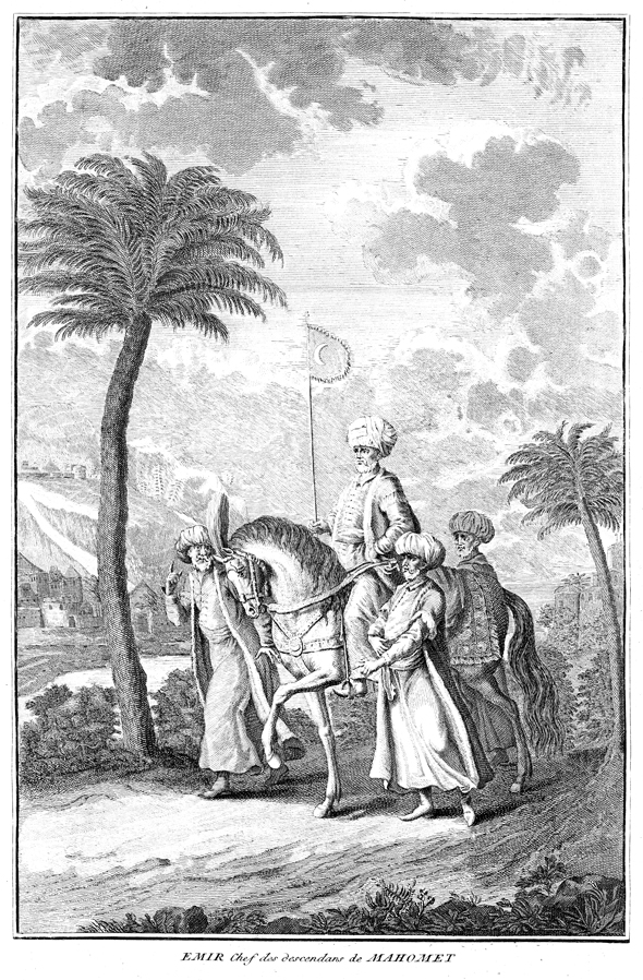 Description: A Muslim caliph, the emir (commander) of the faithful, rides his horse.