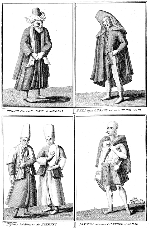 Description: Clockwise from top left: a prior of a Dervish convent; an Ottoman deli, a servant of the grand vizier; a Dervish Qalandar, a type of Sufi ascetic; and different examples of Dervish clothing. Engraved by Francois Morellon la Cave (fl. 1726–1766).
