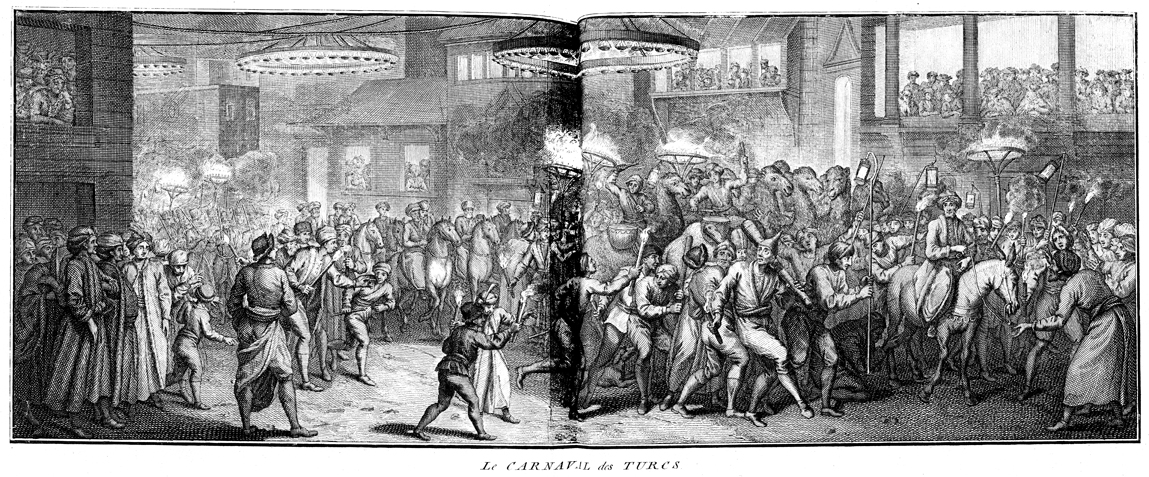 Description: Turkish Muslims celebrate the festival of the night the Qur’an descended from heaven by parading in the streets. Drawn by Louis Fabricius Dubourg (1693–1775) and engraved by Balthazar Bernaerts.
