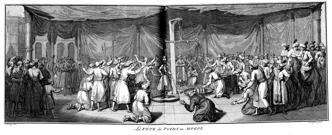 Description: Mughal Muslims celebrate a festival with a large scale, which symbolized the Prince being fair to all. Drawn by Louis Fabricius Dubourg (1693–1775) and engraved by Claude Duflos (1665–1727).