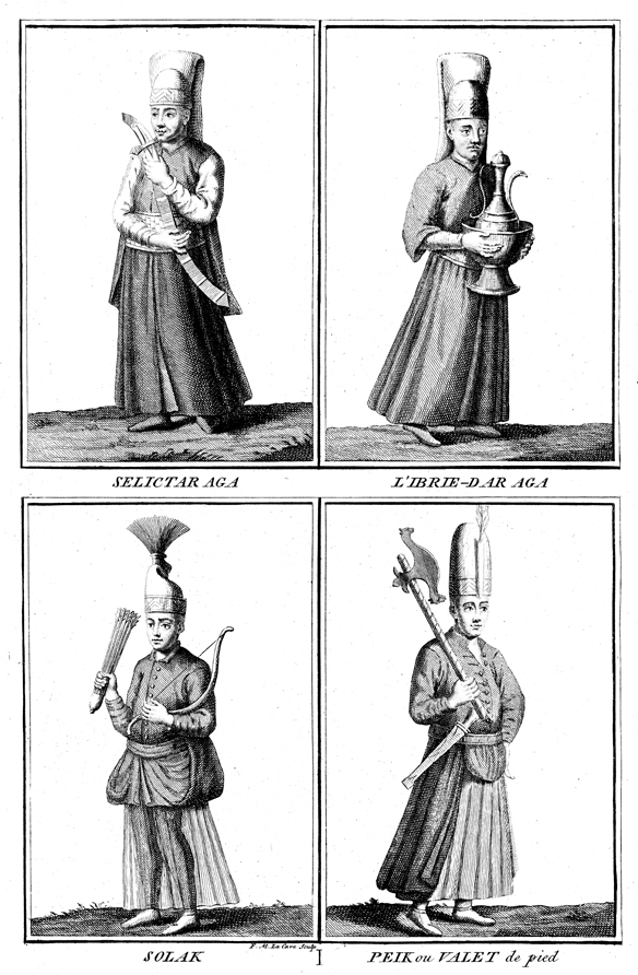 Description: Ottoman soldiers. Clockwise from top left: Selictar Aga (sword bearer), the Ibrie-Dar Aga, the Peik (foot soldier) and the Solak,. Engraved by Francois Morellon la Cave (fl. 1726–1766).