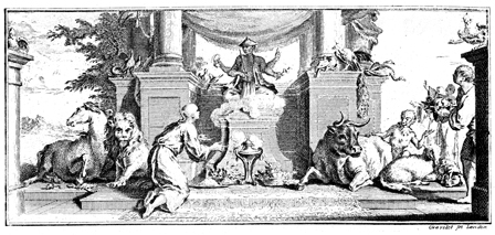 Description: An ornamental headpiece depicting a worshiper at a Hindu shrine surrounded by different animals. Drawn by Hubert-Francois Gravelot (1699–1773).