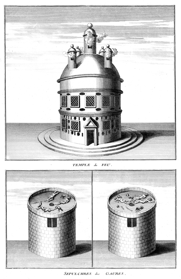 Description: A Persian temple where Zoroastrians would gather in fire-worshiping ceremonies (top). Vultures picking at corpses laid to exposure in accordance with Zoroastrian funeral rituals (bottom).