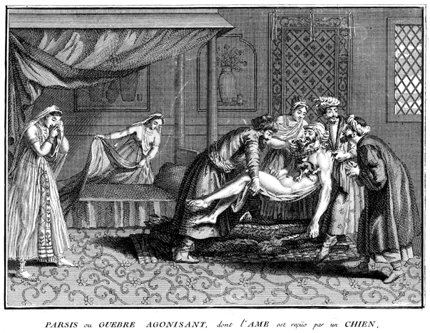 Description: Persian Zoroastrians practice a funeral ritual called Sagdid in which a dog looks into the face of a dead person in order to receive and protect the person’s soul. Drawn by Bernard Picart (1673–1733).