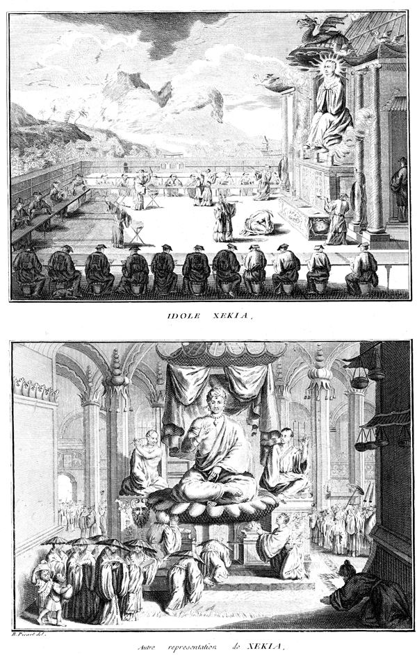Description: Chinese Buddhists pray before statues of the most famous member of the Shakya clan, Siddhartha Gautama, who become a Buddha or Shakyamuni Buddha (top). Alternative representations of Siddhartha Gautama. Drawn by Bernard Picart (1673–1733).