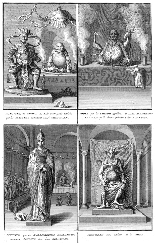 Description: Depictions of Chinese idols. Clockwise from top left: Fo-tek or Ninifo and Kin-Gan, a guardian spirit whom the Jesuits call Chin-Hoan; the God of Immortality, whom some Chinese believe governs their fortune; another depiction of the guardian spirit Chin-Hoan, and the deity the Dutch ambassadors call Lincing.