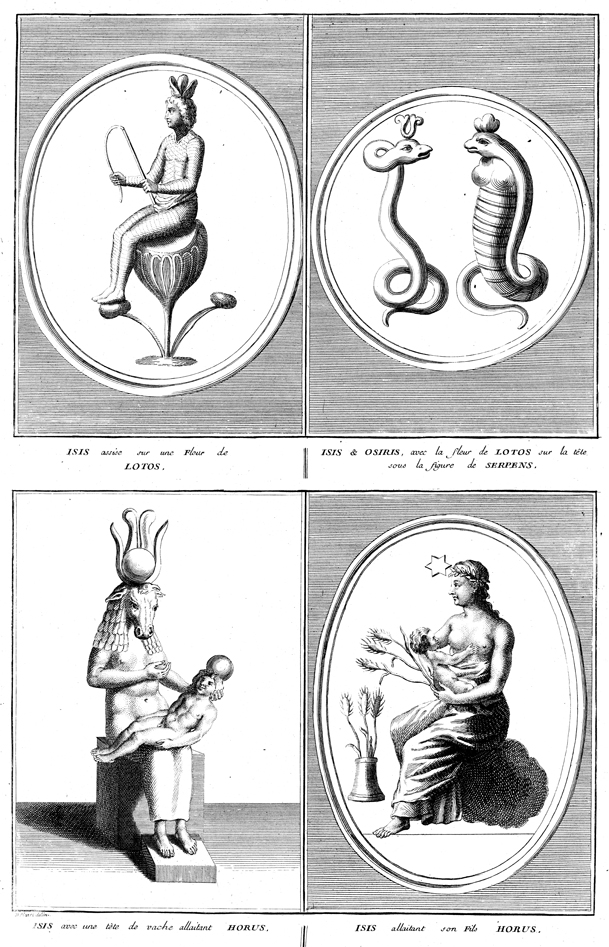 Description: Illustrations of ancient Egyptian gods. Clockwise from top left: In a parallel with Puzza, the Chinese mother goddess, Isis sits in a lotus flower; a representation of Isis and Osiris with the lotus flower on the head of a serpent; Isis holders her son, Horus; and Isis with the head of a cow holds Horus. The parallels between Egyptian deities and Chinese deities led Athanasius Kircher to believe that there is one god who took many forms. Drawn by Bernard Picart (1673–1733).