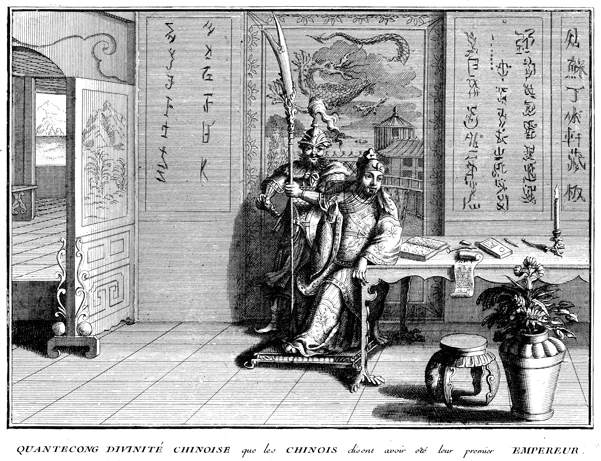 Description: Quante-Cong, the first Chinese emperor plans strategy at his table. Drawn by Bernard Picart (1673–1733).