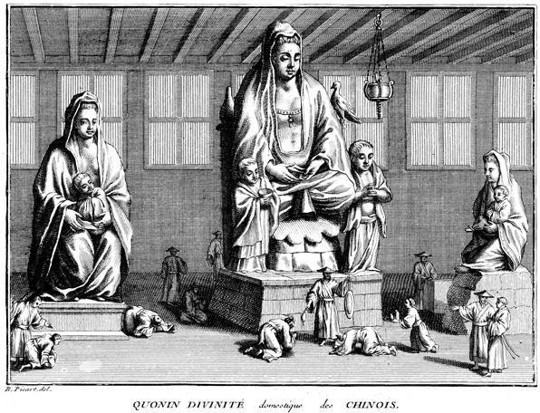 Description: The faithful gather to bow before the idol of Quonin, a Chinese household goddess. Drawn by Bernard Picart (1673–1733).