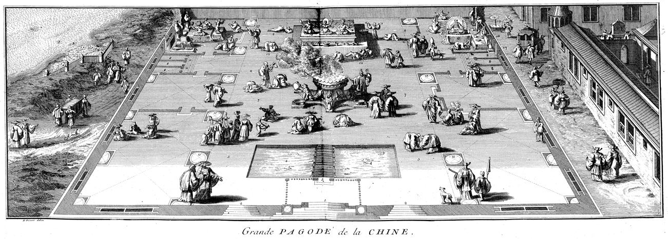 Description: A cut-away illustration of one level of a Chinese pagoda. Drawn by Bernard Picart (1673–1733).