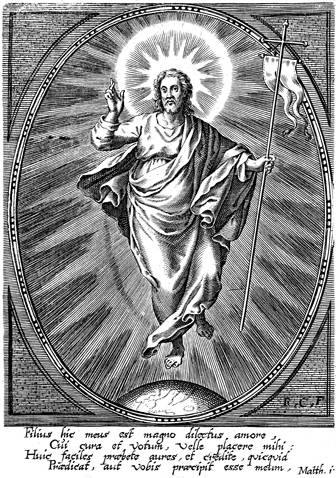 Description: The triumphant Christ stands above the world, an allusion to his having overcome it. He makes the sign of blessing with his right hand and holds a cross-staff with his left. Raphael Custodis Sculps engraved this image.
