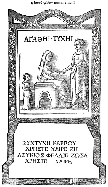 Description: A depiction of two women and a child within a scrollwork border.