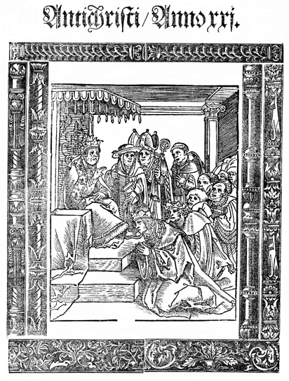 Description: The Pope is depicted as the antichrist with kings bowing before him.
