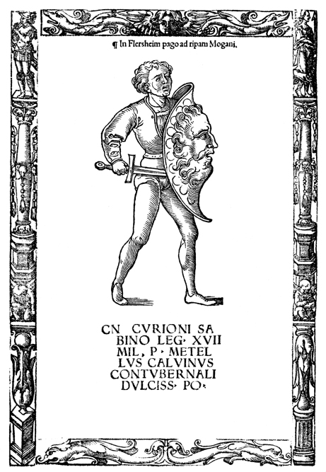 Description: Depiction of a soldier within a four-part ornamental border.