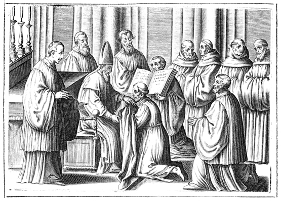Description: This engraving is the second in a series of nine illustrating the blessing of a monk as an abbot. The abbot-elect kneels before the bishop, seated on his throne, who removes the secular clothing he had been wearing and replaces it with the habit.