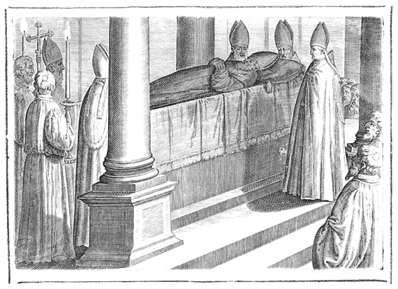 Description: This engraving illustrates a rite performed after the death of certain people in public positions of authority such as cardinals, bishops and rulers. Five bishops stand around the bier, one at each corner and one at the head. Acolytes stand at the feet of the dead bishop with the processional cross and candles, while a series of prayers are said.
