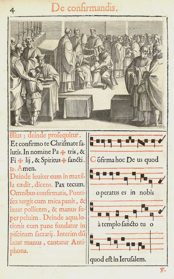 Description: This engraving is the second of two illustrating the sacrament of confirmation. Seated on his throne and with attendant priests at his side, the bishop confirms a child whose sponsor kneels behind him. Another child and sponsor stand before a scribe who is writing the child’s name (?) in a ledger.