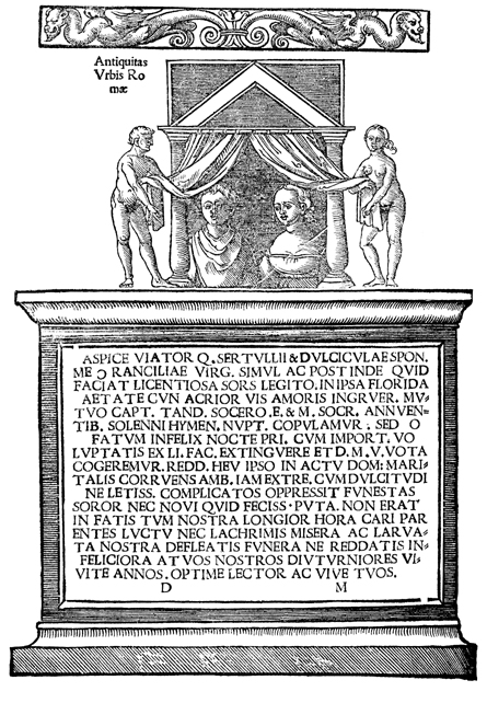 Description: A depiction of a Roman play atop an inscribed pedestal and beneath a scrollwork headpiece.