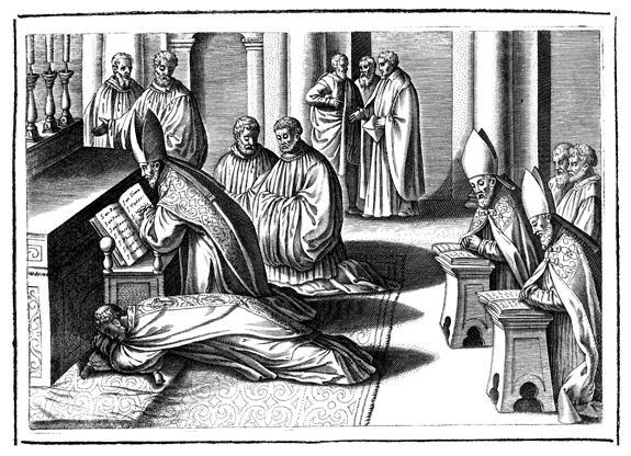 Description: This engraving is the third in a series of twelve illustrating the consecration of a new bishop: the prostration before the altar. The bishop-elect lies fully prostrate on the floor before the altar, while the chief consecrating bishop and his assistant bishops kneel and recite a litany..