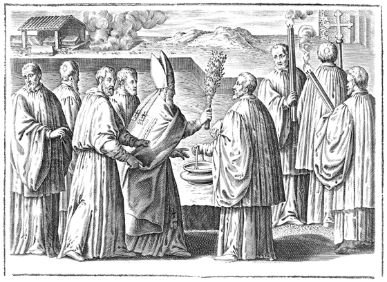 Description: This engraving is the last of five illustrating the blessing and laying the first stone of a new church building. Having placed the stone in the ground, the bishop sprinkles the area with the blessed water once again.