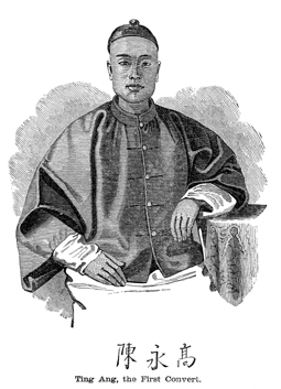 Description: Shows a tradesman named Ting Ang, the first Chinese person baptized (July 14, 1857) by missionaries of the Methodist Episcopal Church at their Teinang Church.
