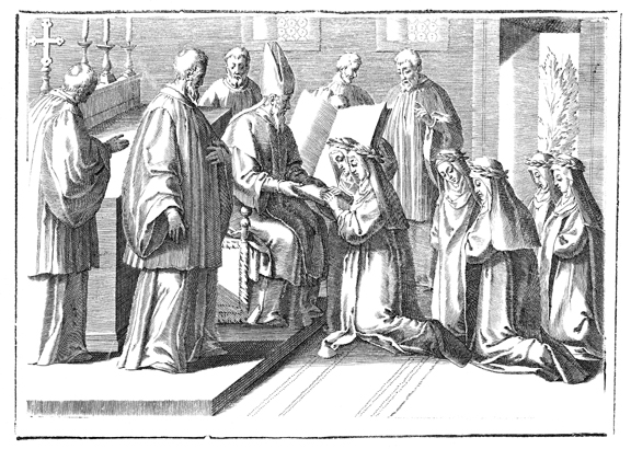 Description: This engraving is the last of nine illustrating the blessing and consecration of a virgin. The Bishop, seated on his throne, offers the breviary to the nuns. Now that they are professed as nuns, it will be their obligation to recite the Divine Office every day. The nuns touch the book with their hands signifying their assent to this obligation.