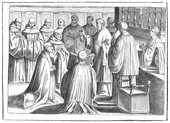 Description: This engraving is the first in a series of nine illustrating the blessing of an abbot. The monk chosen to become an abbot kneels before the presiding bishop wearing his normal, daily clothing. The bishop, surrounded by assistant abbots and priests, blesses him. The community of monks stand as witnesses.