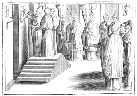 Description: This engraving is the seventeenth of eighteen illustrating the dedication or consecration of a church. The bishop and two priest assistants mount a rolling staircase in order to bless twelve crosses fixed to the walls of the church.