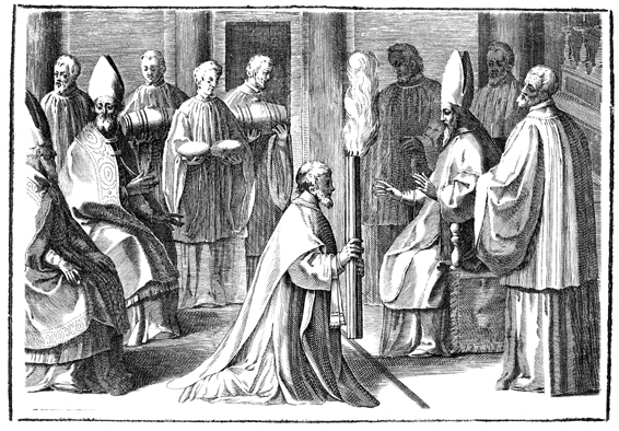 Description: This engraving is the ninth in a series of twelve illustrating the consecration of a new bishop. With a lit candle in his hand, the bishop-elect kneels before the presiding bishop. Assistant priests stand in the background, carrying the loaves of bread and kegs of wine that will be consecrated during the Mass that concludes the consecration.