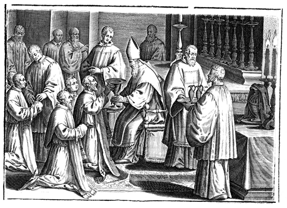Description: This engraving illustrates one aspect of ordination to the priesthood: the blessing of the priests’ hands. The bishop anoints both hands of the new priests with oil and their hands are then wrapped in a linen cloth and blessed. Then the bishop, seated on his throne, offers the chalice, filled with water and wine, and paten holding the host to each new priest who kneels before him.