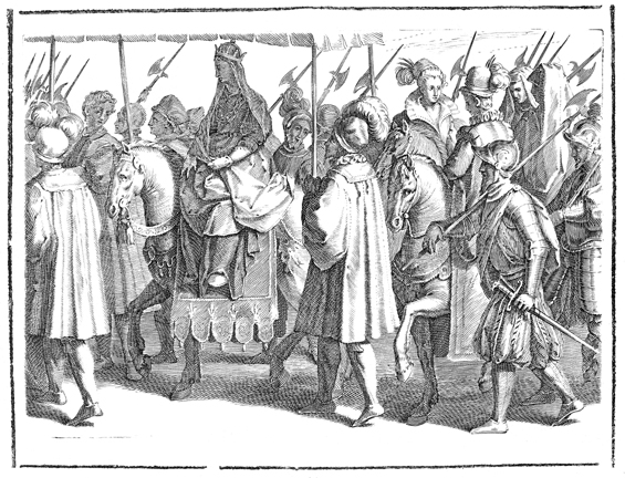 Description: This engraving illustrates a queen traveling with her ladies-in-waiting and attendant men and soldiers.