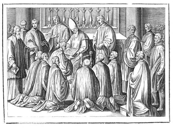 Description: This engraving illustrates ordination to the minor order of exorcist, the third of seven ordinations culminating in full priesthood. The bishop, seated on his throne and surrounded by attendant priests, offers an ornate book (perhaps the book of exorcisms) to one of the ordainees. The tonsure of the ordainees and priests is clearly depicted.