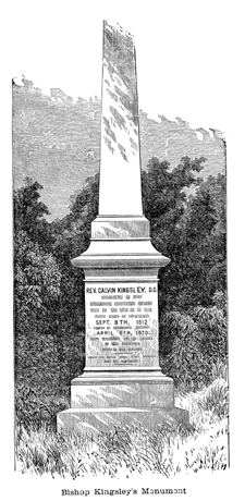 Description: Shows the gravestone for the Rev. Calvin Kingsley, D.D., a bishop of the Methodist Episcopal Church (1812-1870).