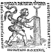 Description: Printer's device of Peter Apian (1495-1552) with Hebrew and Greek text.