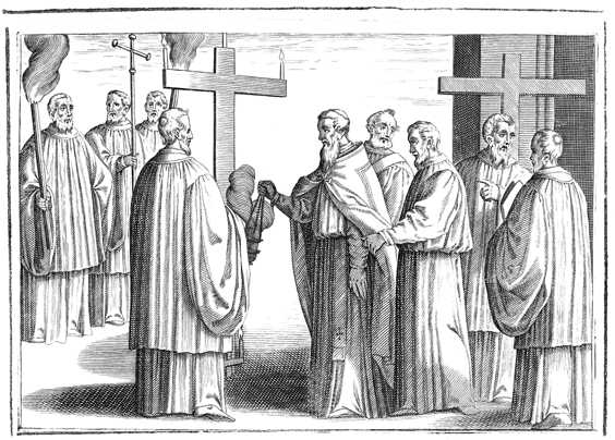 Description: This engraving is the fifth of six illustrating the blessing of a cemetery. The bishop does the same thing at the four outer crosses as he had done at the center. He blesses each cross with incense from the thurible and then places a lit candle at the top of the vertical post and two more candles at each end of the horizontal beam.