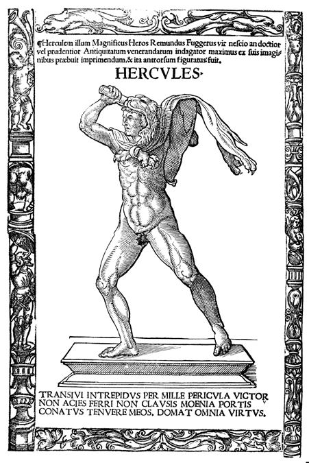 Description: A rendering of the Greek god Hercules with his characteristic lion hood and musculature.