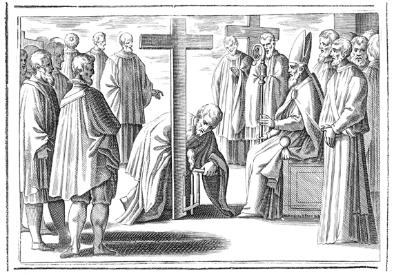 Description: This engraving is the second of six illustrating the blessing of a cemetery. Seated on his throne and holding his crozier, the bishop watches as a man lights the middle candle at the base of one of the five crosses erected in the cemetery.